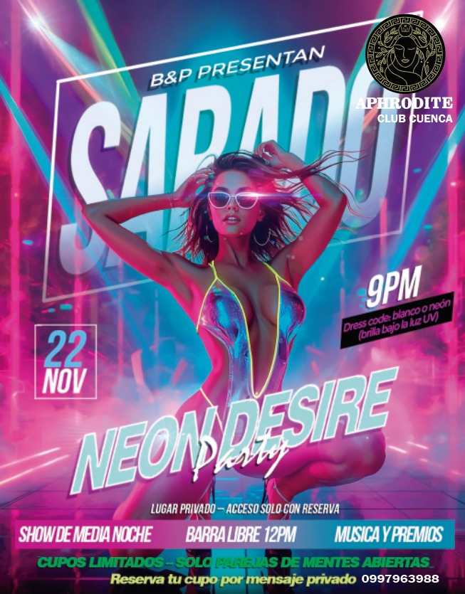 Este 22 de Noviembre se realizará el evento Swinger "NEON DESIRE" en Aphrodite Cuenca, donde contaremos como anfitriones del evento a Pepa y Bruno. Quedan cordialmente invitados!.